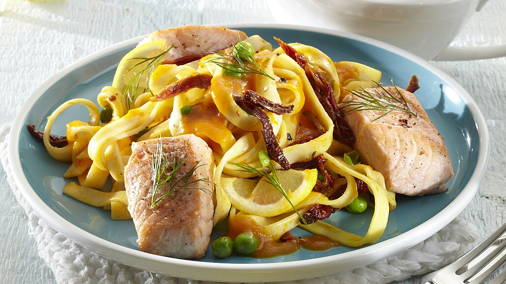- Těstoviny uvaříme dle návodu na obalu na skus. Scedíme je a necháme okapat. Lososa očistíme, nakrájíme na větší kostičky, osolíme a opepříme. Sušená rajčata nakrájíme na nudličky.