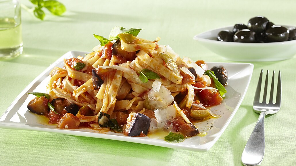 - Na pánvi rozehřejeme olej a opečeme na něm česnek. Postupně přidáme feferonky, lilek, rajčata s nálevem, olivy a několik lístků bazalky. Osolíme, opepříme a promícháme. Přiklopíme a dusíme asi 20 minut. Během dušení omáčku promícháme.