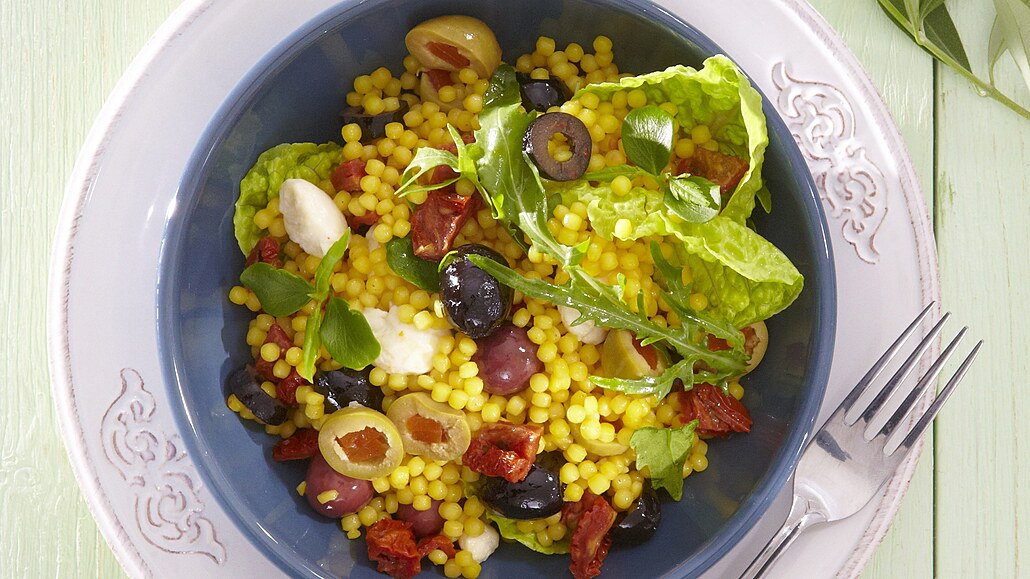 - Sušená rajčata nakrájíme na menší kousky. Mozzarellu a olivy překrojíme. Saláty a bazalku opláchneme a natrháme na menší kousky.