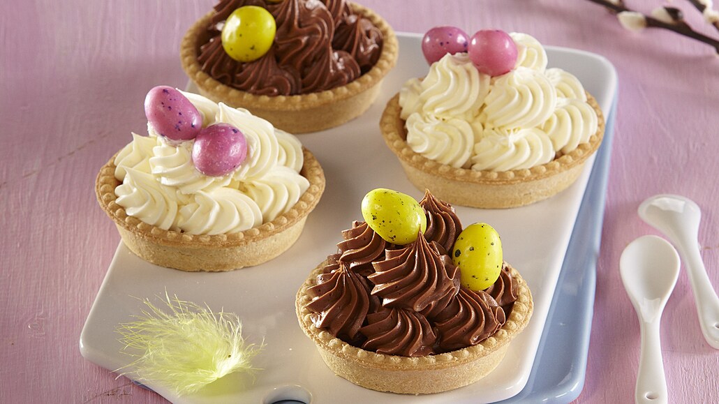 - Krém naplníme do cukrářského sáčku s řezanou trubičkou a nastříkáme do 4 kusů tartaletek a ozdobíme cukrovými vajíčky.