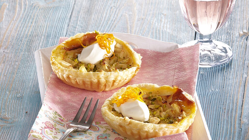 - Jablka oloupeme a vykrojíme jádřince. Pak jablka nakrájíme na malé kostičky a pokapeme je rumem. Rozdělíme je na tarteletky a posypeme pistáciemi..
