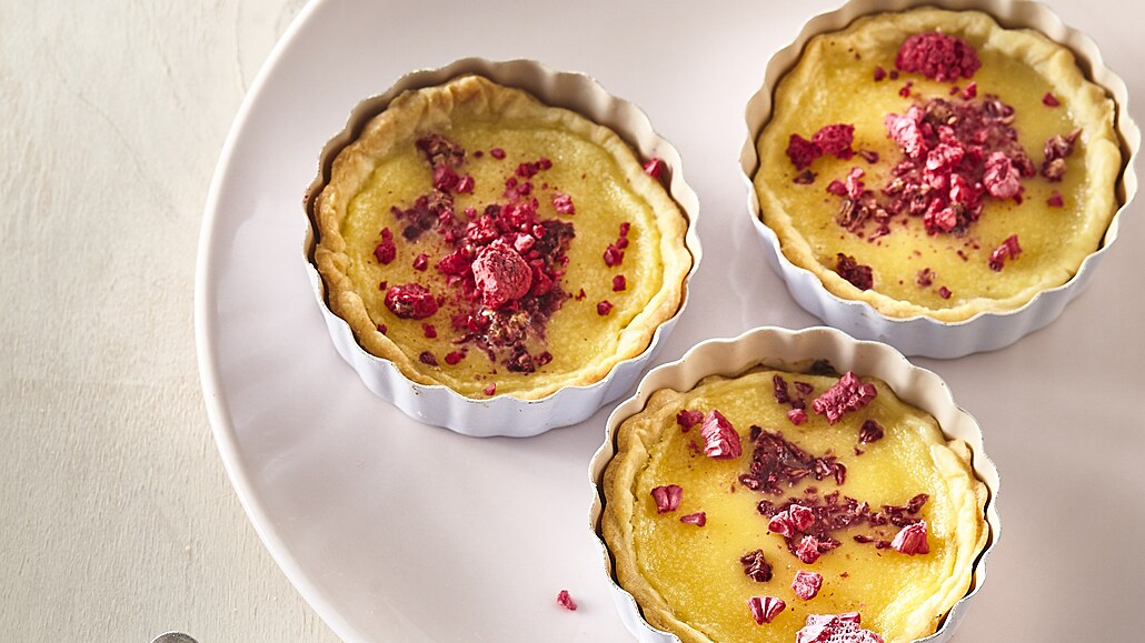 - Tartaletky pečeme v troubě vyhřáté na 170 °C asi 20 minut. Pomazánkové máslo utřeme s cukrem dohladka. Přidáme vejce, žloutek, smetanu, škrob, vanilkový extrakt a prošleháme.