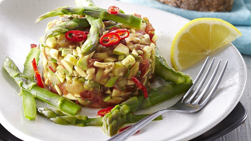 - Tataráček promícháme a na talířích pomocí kulatého tvořítka připravíme jednotlivé porce. Ozdobíme je odloženými špičkami chřestu a na kolečka nakrájenou chilli papričkou. Tataráček podáváme s kousky citronu k dochucení a opečenými plátky chleba.