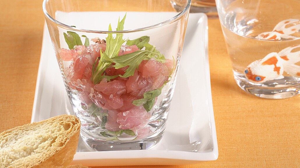 - Zbylý citron omyjeme a rozkrojíme na čtvrtinky. Plátky bílého chleba opečeme nasucho. Tatarák rozdělíme do skleniček, ozdobíme měsíčkem citronu a podáváme s opečeným chlebem.