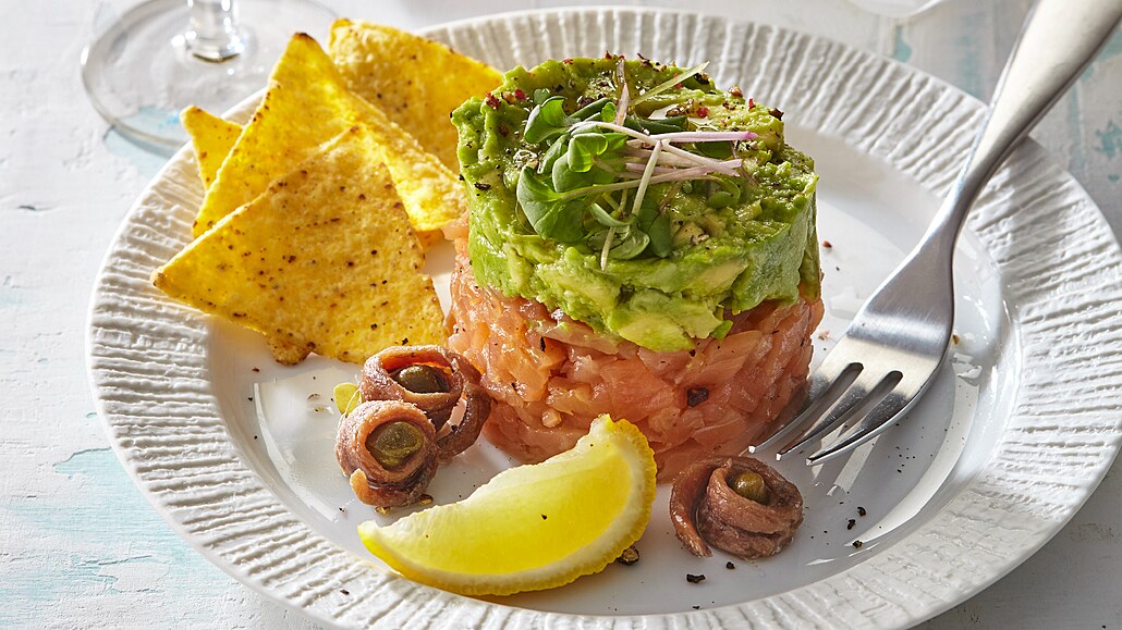 - Tataráček z lososa rozdělíme na talíře, navrch poklademe avokádo, ozdobíme ho ředkvičkovými výhonky, sardelkami s kapary, citronem. Podáváme například s nachos.