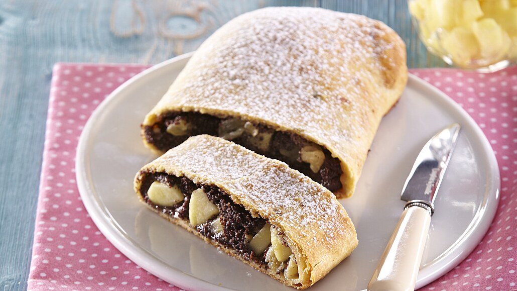 - Jablka oloupeme, nakrájíme a lehce pokapeme citronovou šťávou. Těsto rozválíme na tenký plát. Pak ho přendáme na pomoučněnou utěrku a vytáhneme hřbetem ruky na tenký plát a velikosti asi 60x50 cm. Potřeme ho rozpuštěným sádlem a makovou náplní. Na náplň rozložíme kousky jablek.