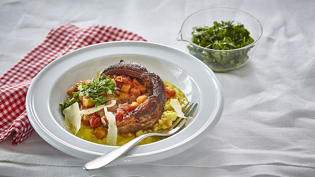 - Po 4 minutách k zelenině přilijeme konzervovaná rajčata, zamícháme a 5 minut vaříme. Pak přilijeme bílé víno, zredukujeme a omáčku nalijeme přes maso v pekáčku. Překryjeme alobalem a vložíme do předehřáté trouby. Pečeme při 160 °C asi 2 hodiny doměkka.