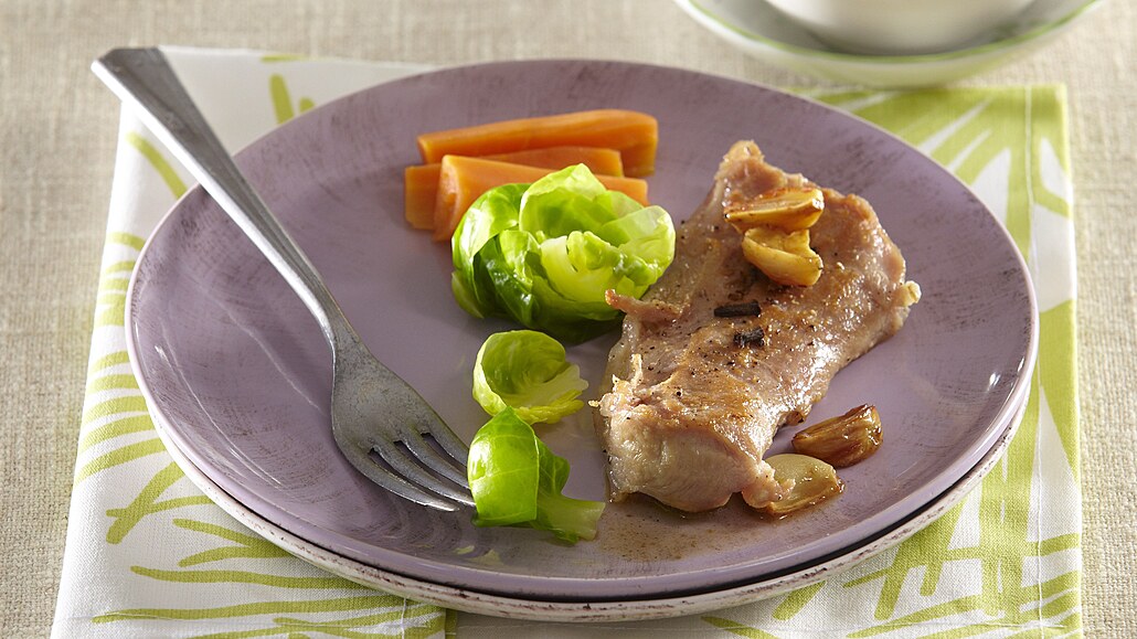 - Pánev mírně zahřejeme a opečeme na ní telecí plátky asi 3 minuty z každé strany. Podáváme je s rozebranou kapustičkou, špalíčky vařené mrkve a celerovým pyré.