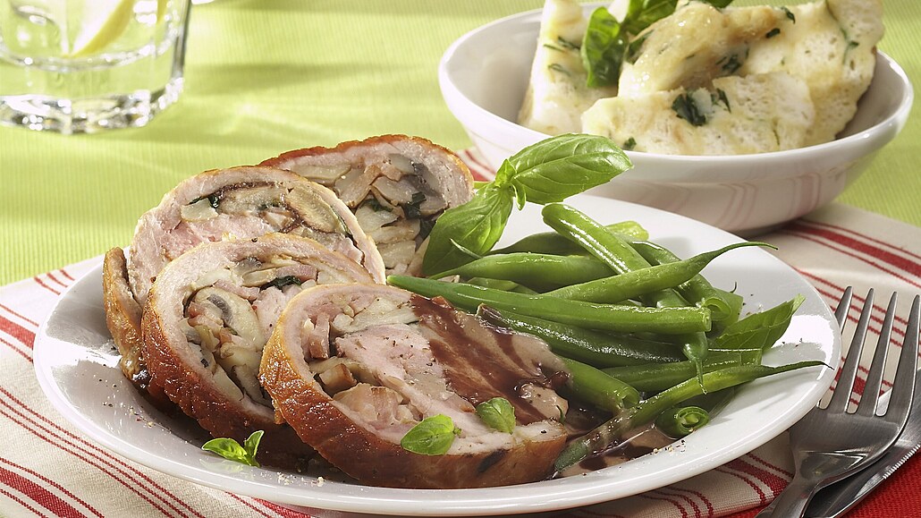 - Plátky masa naklepeme a rozdělíme na ně houbovou náplň. Pak je opatrně stočíme do roládek a převážeme provázkem. Opečeme je na zbylém másle a dáme do vyhřáté trouby. Přiklopíme a pečeme při 180 °C asi 15 minut.
