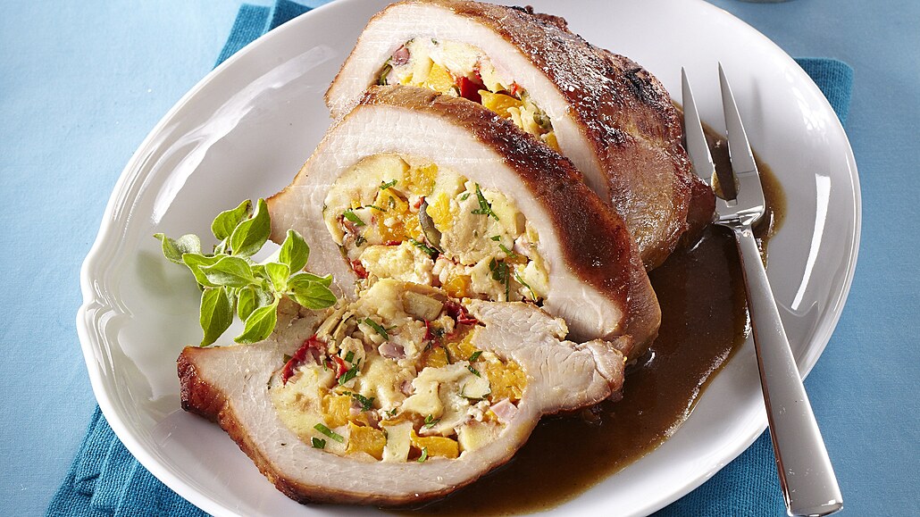 - K namočeným rohlíkům přidáme dýni, uzené maso, kapii, bylinky, dýňová semínka a vejce. Vše promícháme, směsí naplníme kapsu a otvor uzavřeme špejlí. Maso osolíme, opepříme, pokmínujeme a vložíme do pekáčku. Přidáme máslo, podlijeme trochou vody a v předehřáté troubě při 200 °C pečeme doměkka. Během pečení maso přeléváme výpekem a podléváme vodou.