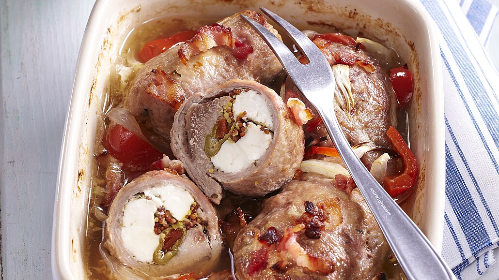 - Ve výpeku v pánvi orestujeme nadrobno nakrájenou slaninu a cibuli. Přilijeme víno a zredukujeme ho. Vše přilijeme do pekáčku k závitkům. Maso podlijeme vývarem a dáme do trouby. Při 190 °C je pečeme asi 50 minut.