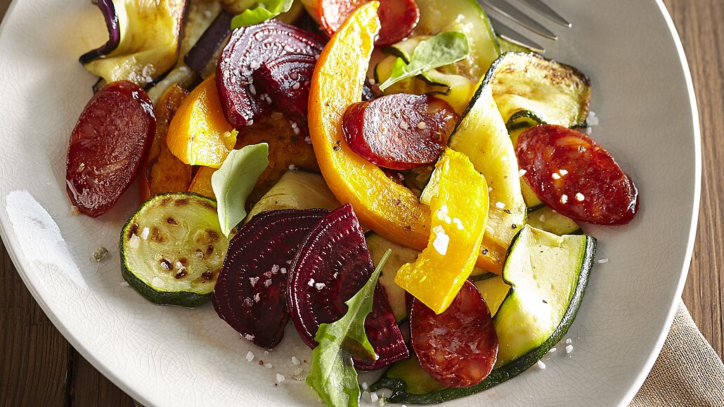 - Klobásu nakrájíme na menší kousky. Pak zeleninu osolíme a opepříme, orestujeme na olivovém oleji v pánvi. Opékáme je z každé strany asi 3 minuty, dýni opékáme déle - asi 6 minut. Po opečení vložíme do teplé trouby. Nakonec opečeme řepu a klobásu.
