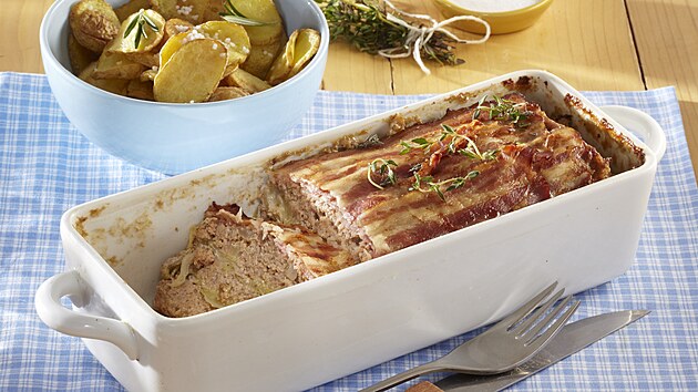- Nahoru rozetřeme zbylou fáš a zakryjeme ji plátky slaniny. Formu přiklopíme poklicí nebo zakryjeme alobalem a terinu pečeme ve vyhřáté troubě při 180 °C asi 40 minut. Pak ji odklopíme a dopečeme při 200 °C dozlatova. Podáváme s různě upravenými brambory.