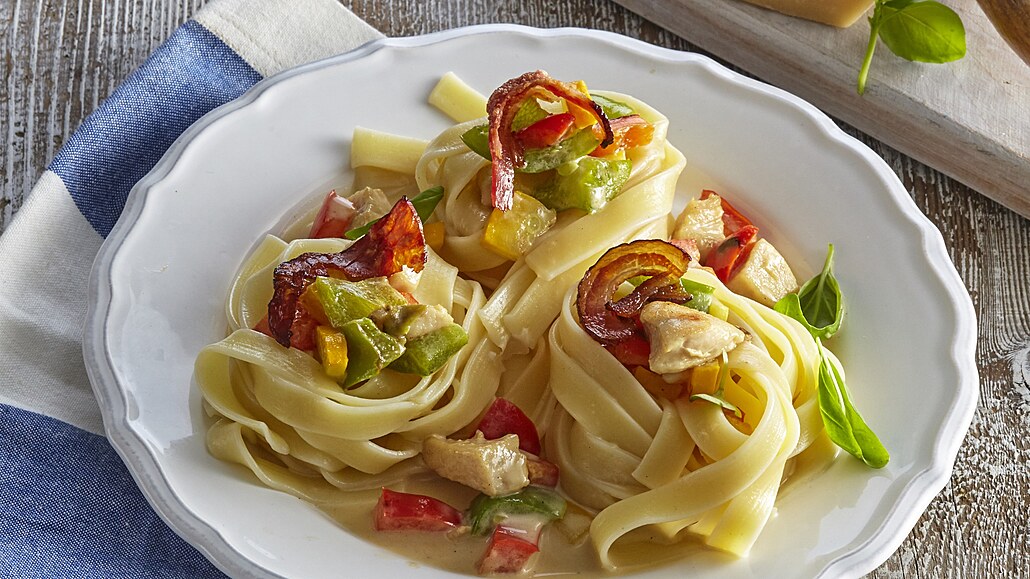 - Těstovinová hnízda rozložíme na talíře. Naplníme je podušenou zeleninou s masem, podlijeme omáčkou a doplníme upečenou slaninou, parmezánem a bazalkou.