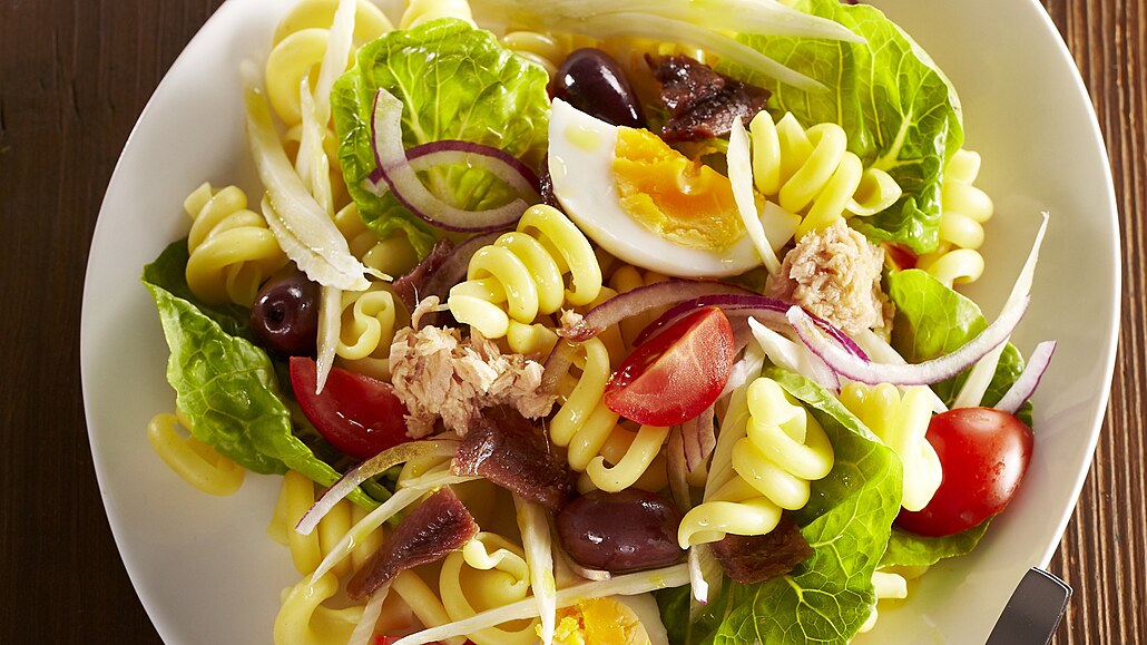 - Olej prošleháme s octem, solí, pepřem a sušeným oreganem. V míse promícháme natrhaný salát, fenykl, cibuli, rajčátka a těstoviny. Salát rozdělíme na talíře, posypeme olivami, nakrájenými ančovičkami, tuňákem a ozdobíme kousky vajec. Jednotlivé porce pokapeme zálivkou a podáváme.
