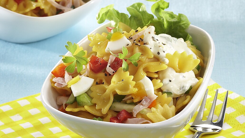 - Uvařené těstoviny vložíme do větší mísy, přidáme nakrájenou zeleninu, bílý mletý pepř, sůl a vařečkou vše promícháme. Pak přidáme tatarskou omáčku, kterou vše už jen zlehka spojíme. Misky vyložíme listy hlávkového salátu, rozdělíme do nich těstovinový salát a dozdobíme bylinkami.