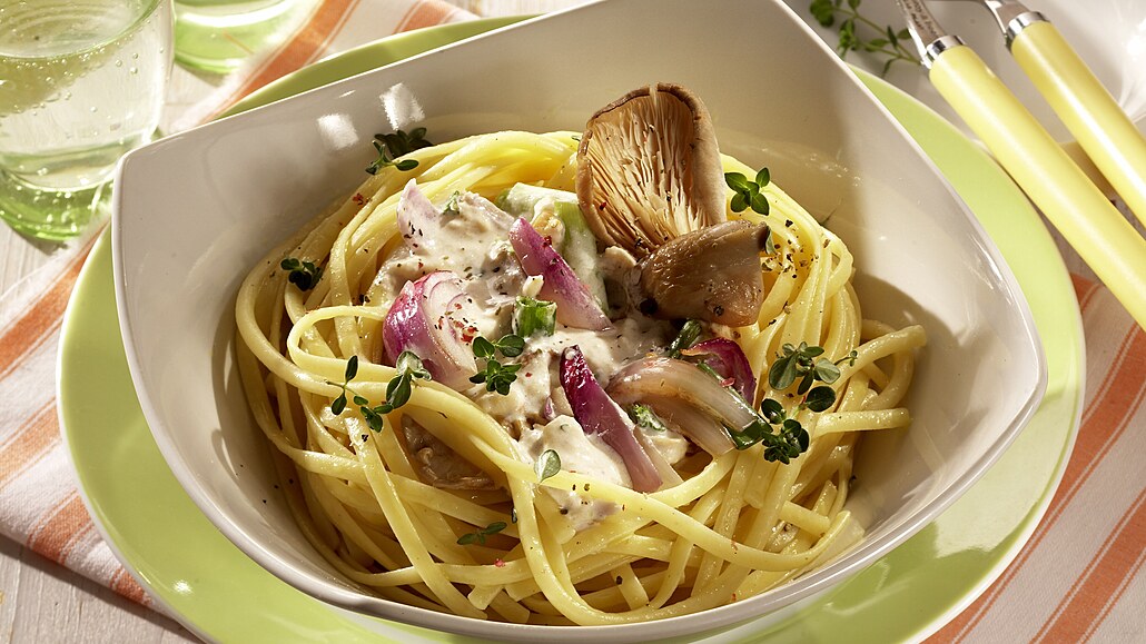 - Na pánvi rozehřejeme olej a osmahneme na něm cibuli. Přidáme houby a orestujeme je. Zalijeme je smetanou, osolíme, opepříme a 10 minut povaříme.