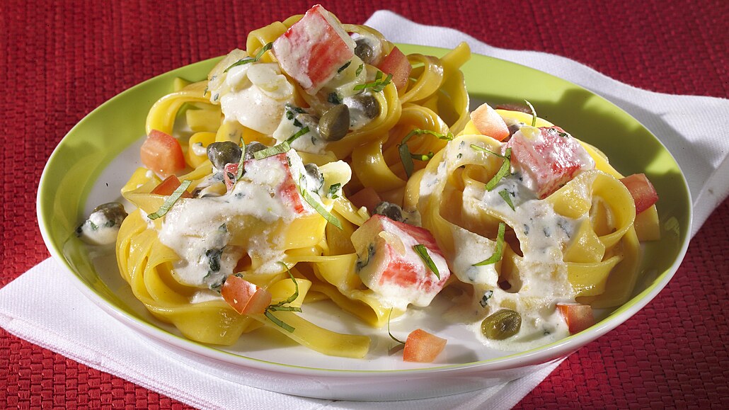 - Na oleji zpěníme nadrobno nakrájený česnek, přidáme nasekanou bazalku a krabí tyčinky pokrájené na špalíčky. Mírně osolíme, opepříme a asi 3 minuty dusíme.