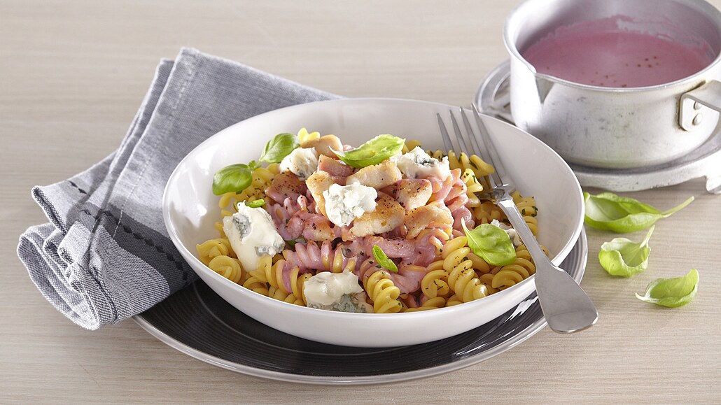- Hotovou omáčku rozmixujeme dohladka. Dochutíme ji solí, pepřem a citronovou šťávou. Těstoviny uvaříme dle návodu na obalu. Maso nakrájíme na kousky a orestujeme na zbylém oleji. Těstoviny a maso rozdělíme na talíře, přelijeme omáčkou a posypeme lístky bazalky. Můžeme doplnit kousky sýra.