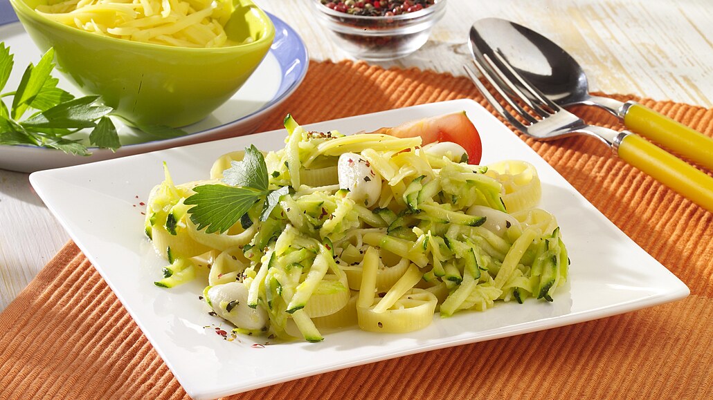 - Orestovanou cuketu zamícháme do teplých těstovin. Přidáme zakysanou smetanu. Pokrm podle chuti dosolíme, opepříme a rozdělíme na talíře. Každou porci posypeme strouhaným sýrem.