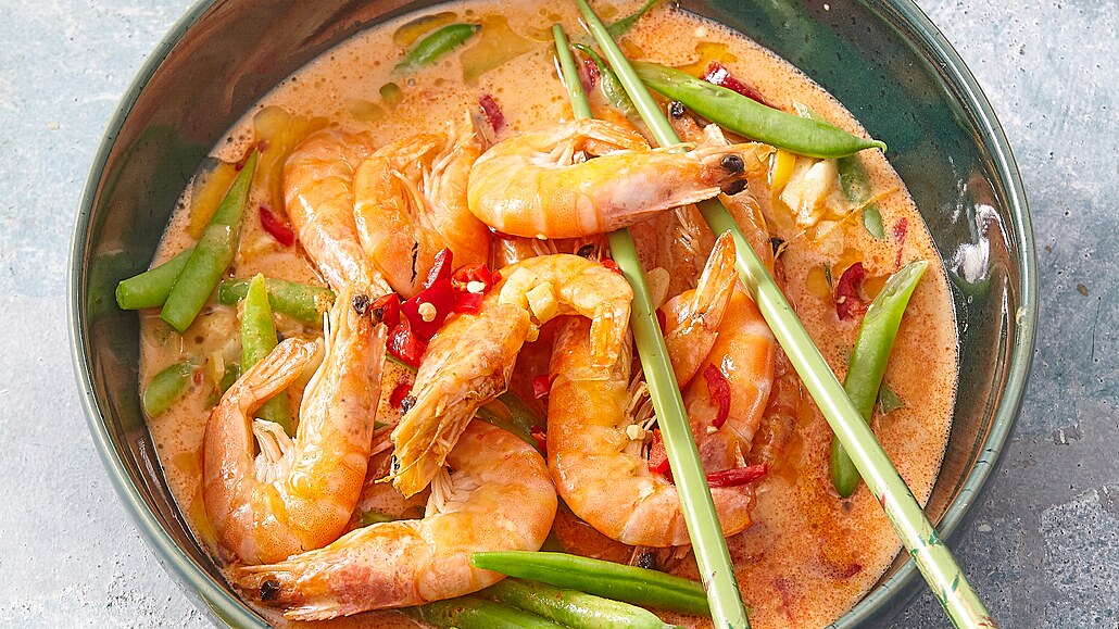 Thajské krevety v kokosovém mléce s červeným kari a fazolkami – Autentický asijský recept