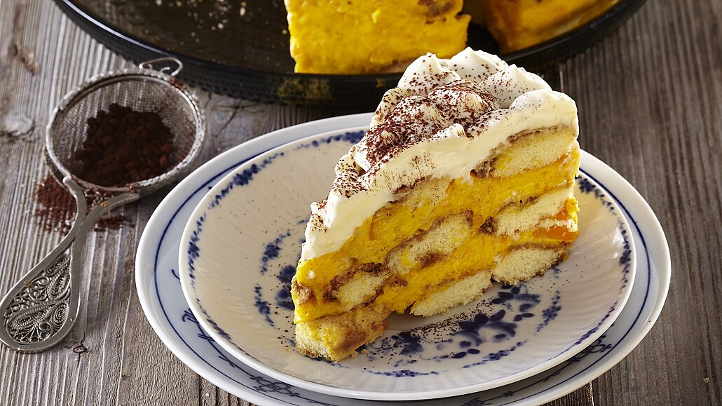 - Na dno rozevírací dortové formy rozložíme vrstvu piškotů, které pokapeme kávou a potřeme dýňovým krémem. Postup ještě jednou zopakujeme a na poslední vrstvu piškotů nastříkáme pomocí cukrářského sáčku zbývající smetanový krém. Tiramisu dáme asi na 3 hodiny odpočinout do lednice. Před podáváním jej posypeme kakaem.