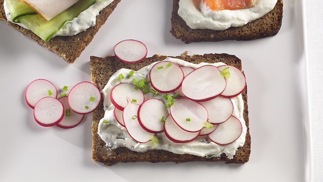 - Na pažitkouvou poklademe plátky ředkviček a podle chuti přisolíme. Na pomazánku s křenem a citronovou šťávou přidáme na polovinu překrojený plátek lososa a plátky cibulky.