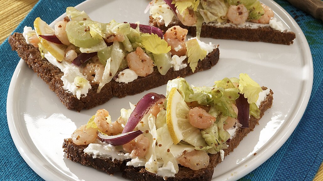 - Plátky chleba úhlopříčně překrojíme na trojúhelníky. Dáme je na plech, ve vyhřáté troubě opečeme dokřupava (nebo je jednoduše opečeme v toastru) a necháme vychladnout. Trojúhelníky potřeme žervé a rozdělíme na ně krevetkový salát. Citron omyjeme, nakrájíme na dílky a chlebíčky jimi ozdobíme.