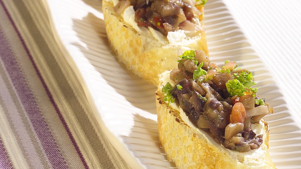 - Mezitím nakrájíme bagetu na tenké plátky a nasucho je opečeme na teflonové pánvi nebo v troubě dozlatova. Zchladlé plátky bagety potřeme pomazánkovým máslem a navršíme na ně vychladlou lilkovou pomazánku.