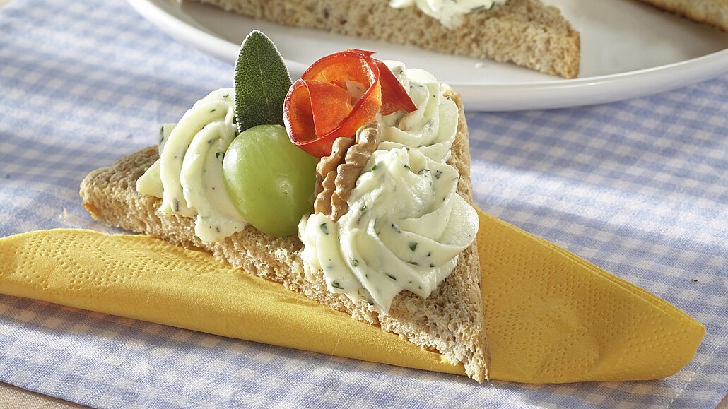 - Hroznové víno, kopr i lístky šalvěje opláchneme a necháme okapat. Kapii nakrájíme na dlouhé tenké plátky. Pomazánku dáme do zdobicího sáčku s řezanou trubičkou a nastříkáme ji na toasty, které pak ozdobíme ořechy, stočenými plátky kapie, hroznovým vínem, lístkem šalvěje a kouskem kopru.