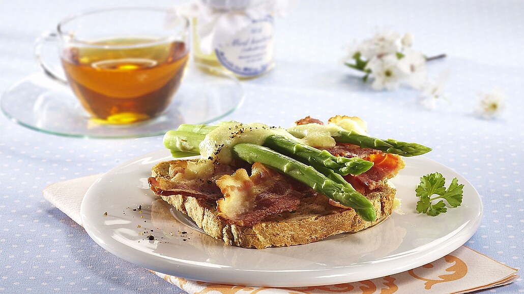 - Opečené toasty potřeme tenkou vrstvou másla, obložíme plátky slaniny a na ně dáme okapaný chřest. Mozzarellu najemno nastrouháme a promícháme se smetanou a žloutky.
