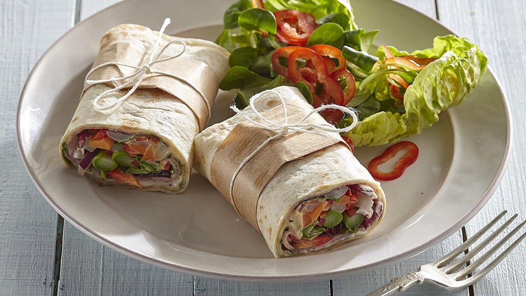 - Torlilly opečeme z obou stran na suché pánvi, poté je z jedné strany potřeme majonézou, poklademe listy salátu a navrch rozdělíme vždy část zbylé zeleniny a zarolujeme.