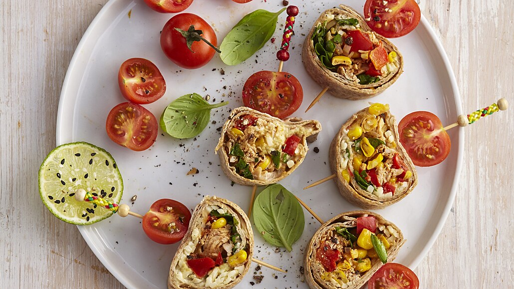 - Hotové tortilly nakrájíme na plátky, propíchneme párátkem například s půlkou rajčátka a podáváme. Tortilly můžeme zakápnout například limetkou.