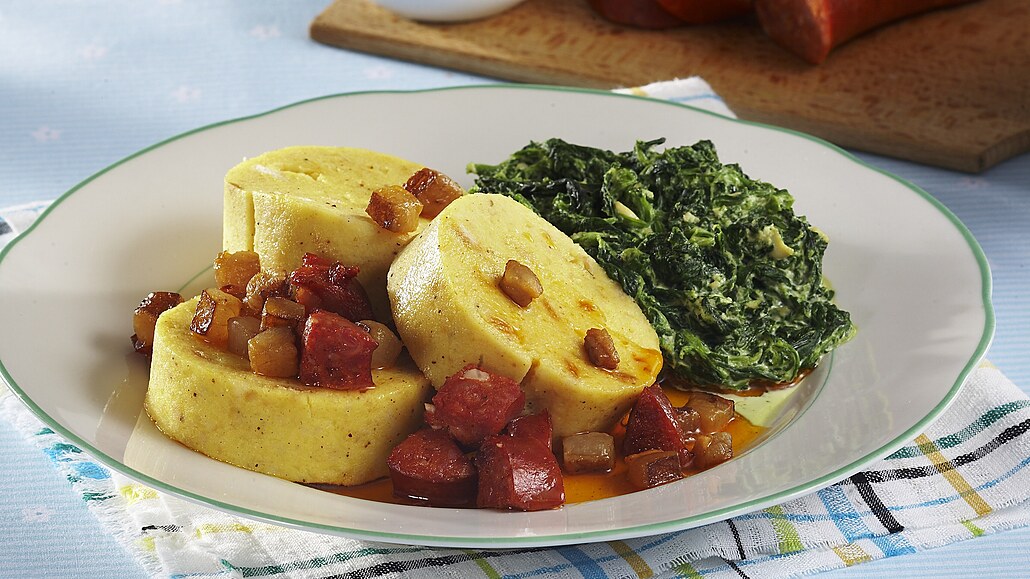 Poctivá selská kuchyně v nejčistší podobě kombinuje jemné bramborové těsto s uzenou slaninou a šťavnatou klobásou. Technika vaření knedlíku v ubrousku zajišťuje jeho neobyčejnou vláčnost, která v doprovodu dušeného špenátu vytvoří dokonalý hřejivý oběd. Tento tradiční pokrm provoněný muškátovým květem vás spolehlivě vrátí k poctivým kořenům české gastronomie.