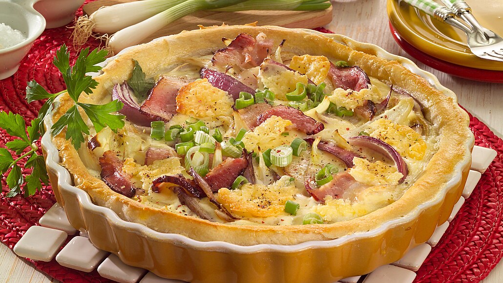 Tradiční pokrm z nadýchaného kynutého těsta sází na klasické spojení orestované cibule a uzené slaniny. Dvojfázové pečení se smetanovou zálivkou zajistí dokonalou vláčnost náplně, kterou v závěru krásně osvěží čerstvě nasekaná cibulová nať na povrchu.
