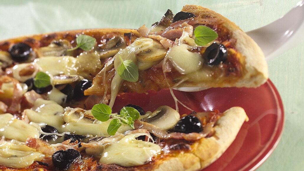 - Z každého bochánku vyválíme kulatou placku, kterou potřeme drcenými rajčaty, přičemž ponecháme asi 1,5 cm okraj volný. Rajčata posypeme mozzarellou a sušenou bazalkou, na sýr rozdělíme žampiony, šunku a olivy. Pečeme v dobře vyhřáté troubě při 250 °C asi 5 minut. Hotovou pizzu ozdobíme čerstvými bylinkami a podáváme.
