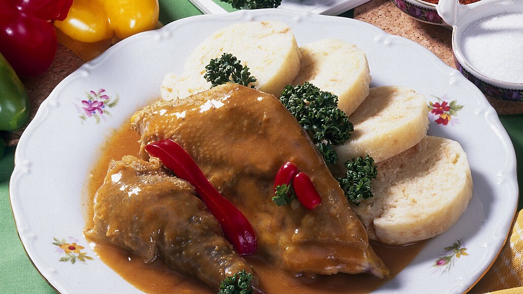 - Jemně nakrájenou cibulku osmahneme dorůžova na třetině tuku, přisypeme mletou papriku a krátce zasmahneme (stačí pouze chvíli, paprika by nám zhořkla). Zalijeme vodou a uvedeme do varu. Do vroucího základu vložíme naporcované slepice a dusíme je téměř doměkka a vyjmeme.