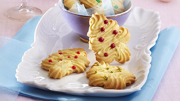 - Na plechy vyložené pečicím papírem nastříkáme z těsta stromečky. Posypeme je cukrovými kuličkami a vložíme do předehřáté trouby. Při 180 °C je pečeme asi 15 minut.