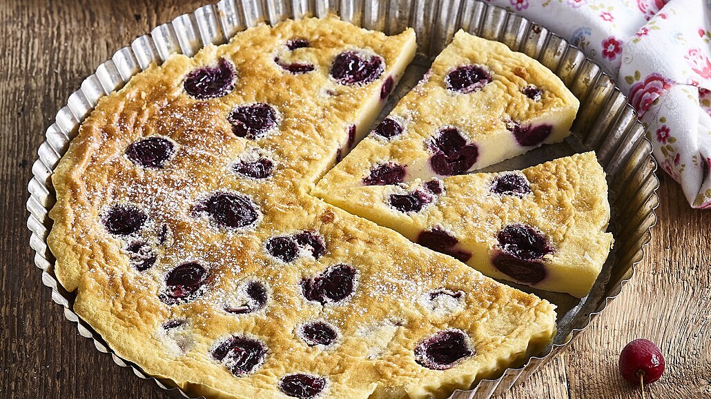 - Formu vymažeme máslem, vysypeme cukrem a na dno rozprostřeme naložené třešně. Opatrně přelijeme těstem a vložíme do předehřáté trouby. Pečeme při 180 °C přibližně 30 minut.