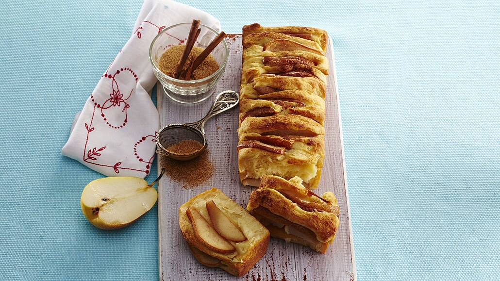 - Do jednotlivých kousků těsta dáme vždy plátek hrušky a přehneme napůl. Naplněné kousky vložíme těsně za sebou do formy na chlebíček. Mezi dílky těsta vkládáme ještě zbylé plátky hrušek. Buchtu necháme ještě 15 minut kynout. Pečeme ve vyhřáté troubě při 180 °C asi 35 minut. Před podáváním můžeme trhací buchtu posypat skořicí.