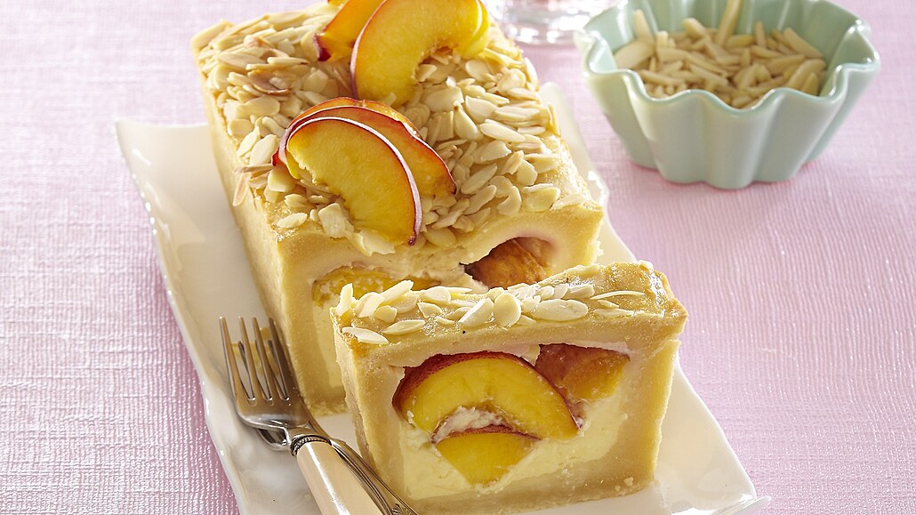 - Zbylé těsto rozválíme, položíme na broskve, okraje přitiskneme a povrch propícháme vidličkou. Pečeme při 165 °C asi 20 minut, pak potřeme rozšlehaným vejcem a posypeme mandlemi. Pečeme dalších 20 minut.