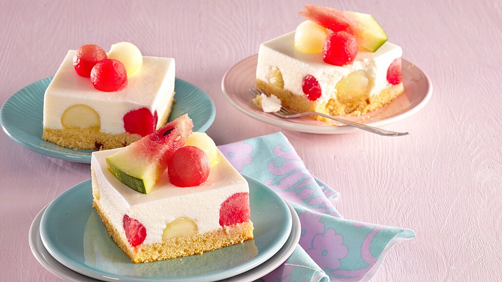 - Krém rozetřeme na korpus s melounovými kuličkami a necháme v lednici několik hodin ztuhnout. Kostky krájíme ostrým nožem namočeným v horké vodě a před podáváním ozdobíme kousky melounu.