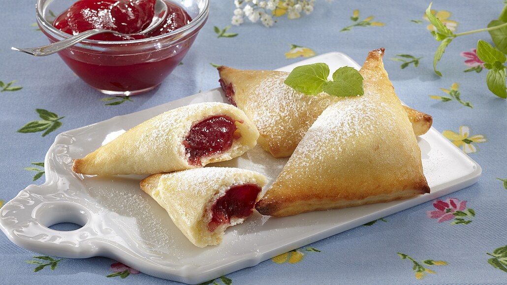 - Odleželé těsto rozválíme na plát silný asi 3 mm a rozkrájíme ho na 16 čtverců. Jejich okraje potřeme žloutkem rozšlehaným s mlékem. Do středu čtverců rozdělíme zavařeninu a těsto přeložíme přes náplň do trojúhelníků. Okraje šátečků k sobě dobře přitiskneme a zakrojíme rádélkem.
