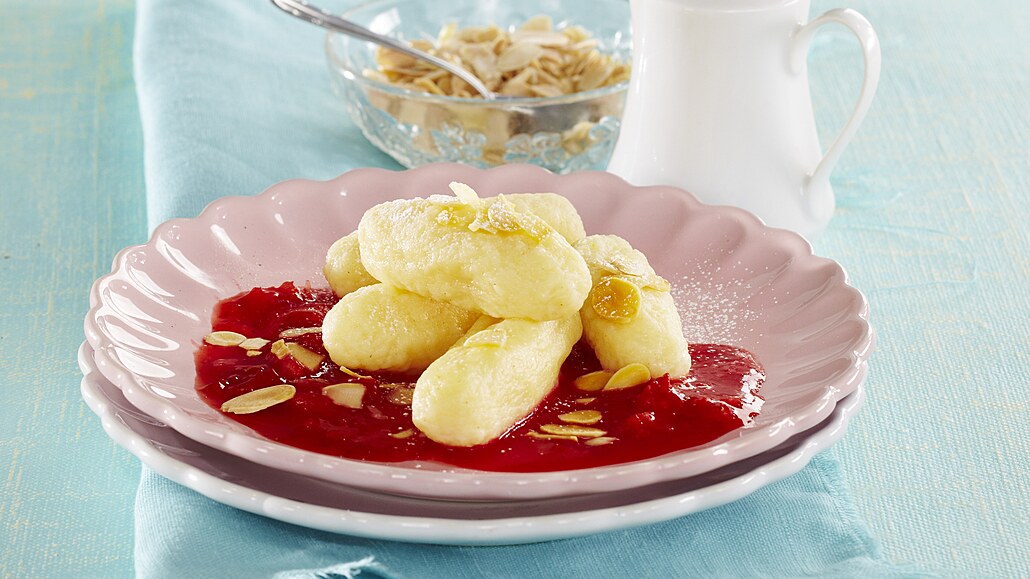 - Jahody očistíme a rozmixujeme. Pyré dle potřeby osladíme. Mandlové plátky nasucho opražíme. Šišky rozdělíme na talíře, přelijeme omáčkou a posypeme mandličkami.