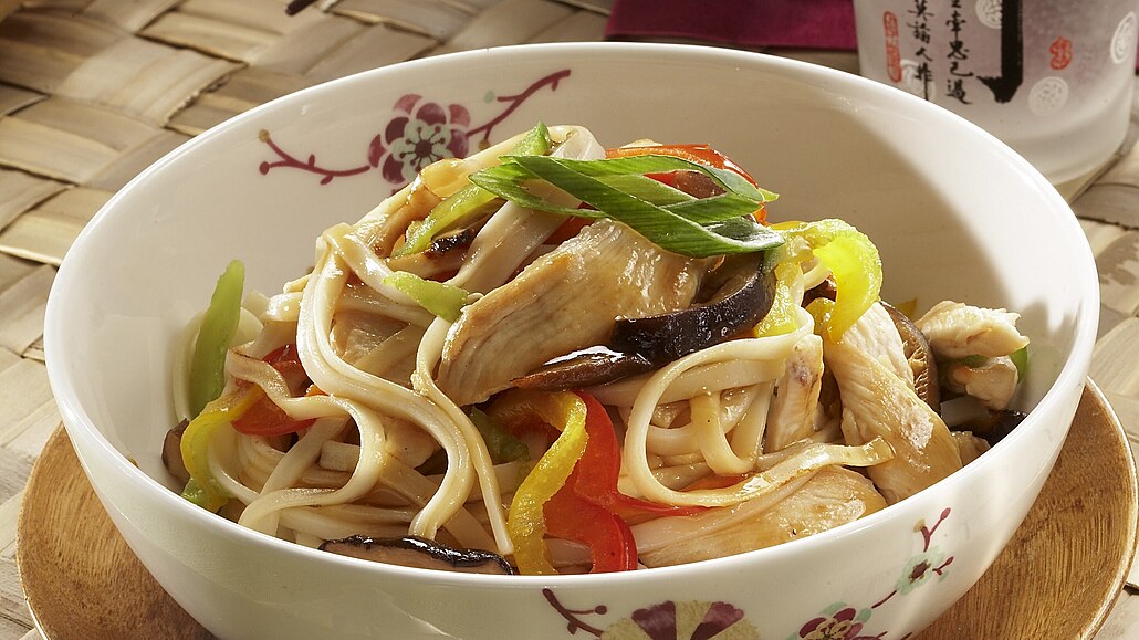 - V pánvi rozehřejeme olej a zprudka na něm orestujeme kuřecí maso. Přidáme zeleninu a osmahneme ji. Nakonec vmícháme nudle a necháme je prohřát.