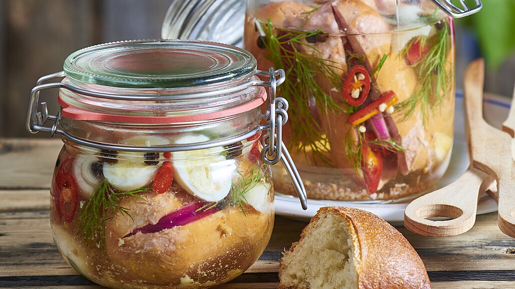 - Špekáčky rozpůlíme, červenou cibuli oloupeme a nakrájíme na měsíčky, chilli nakrájíme na plátky. Špekáčky naplníme cibulí s chilli, naskládáme do skleniček, přidáme rozpůlená křepelčí vajíčka, snítky kopru, zbylou chilli papričku a cibuli. Zalijeme připraveným lákem a necháme alespoň dva dny uležet v chladničce.