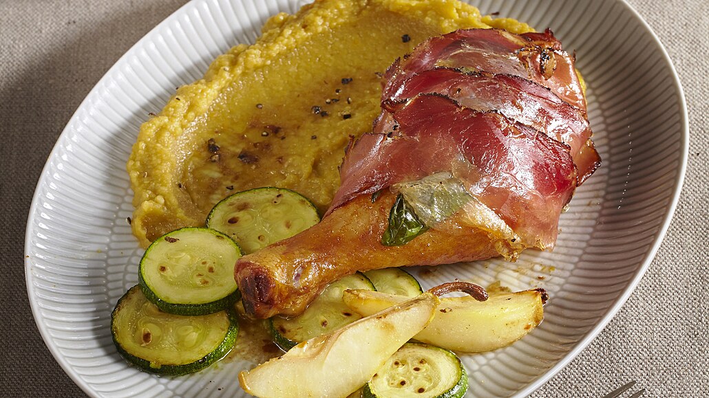 - Cuketu opláchneme, osušíme a nakrájíme na plátky. V hluboké pánvi ji opečeme zprudka do zlatova, osolíme a opepříme. Na talíře rozdělíme kaši, přidáme stehna s hruškami, cuketu a podlijeme výpekem.
