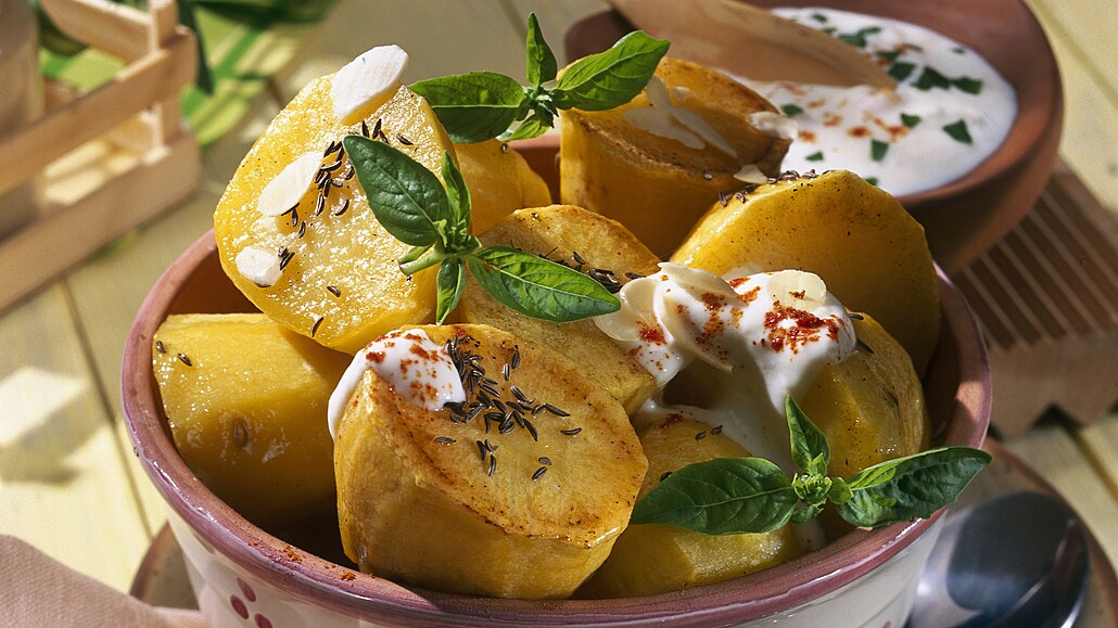- Měkké dozlatova upečené brambory přednáme na talíře a ozdobíme několika snítkami čerstvé bazalky. Toto jídlo je vhodné jako příloha ke grilovaným masům nebo jako samostatné bezmasé jídlo. Podáváme s čerstvým zeleninovým salátem.
