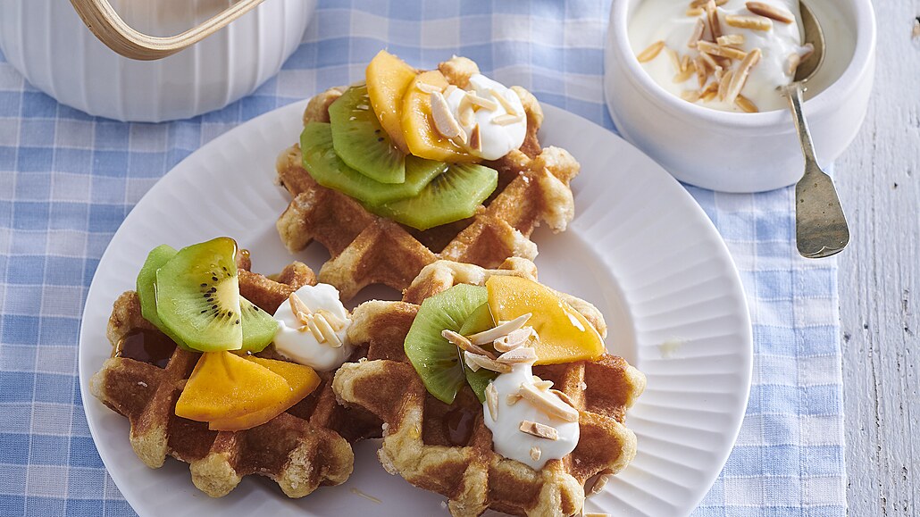 - Ovoce oloupeme a nakrájíme na dílky. Hotové vafle dozdobíme ovocem, smetanou, posypeme mandlemi a přelijeme medem.