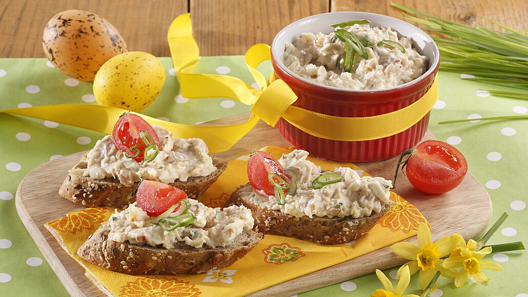 - Jarní cibulky očistíme a nasekáme nadrobno (nať a bílou část zvlášť). Slaninu nakrájíme na kostičky a s bílou částí cibulek ji opečeme v pánvi na rozehřátém másle. Směs necháme zchladnout a přidáme ji do mísy. Trochu cibulové natě odložíme stranou na ozdobení a zbylou vmícháme do pomazánky, kterou podle chuti osolíme a opepříme.